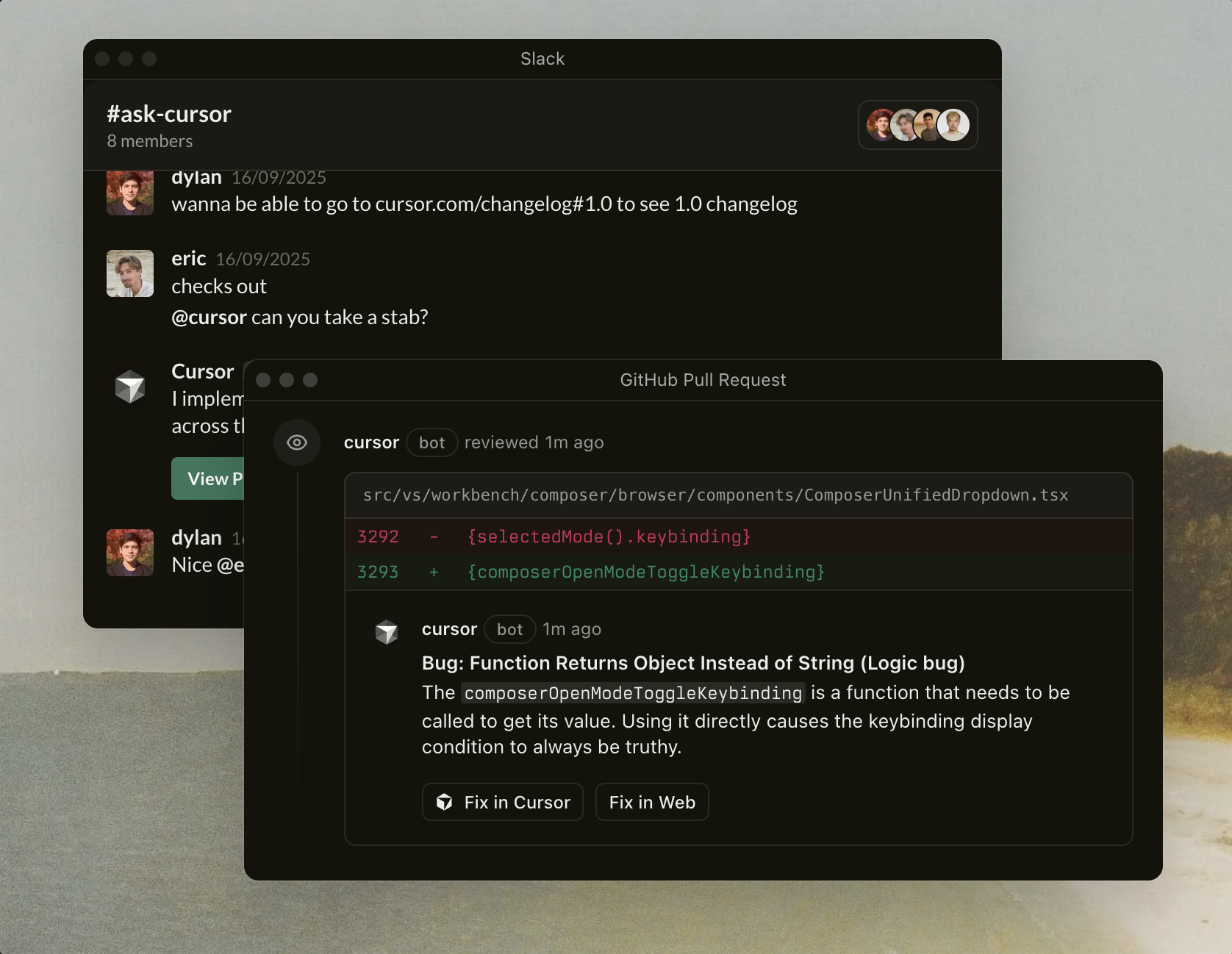Cursor is in GitHub reviewing your PRs, a teammate in Slack, and anywhere else your work.